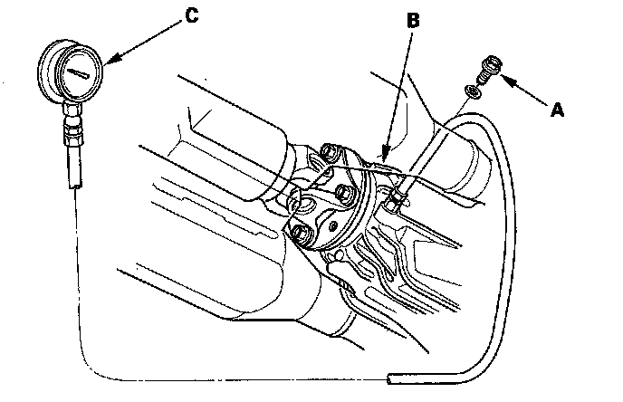 6. Connect the pressure gauge (C) to the adapter, and install the assembly into the differential (B). Route the hose under the vehicle toward the front door.