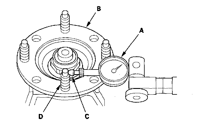 1. Set a dial indicator (A) on the transfer companion flange (B); position the dial indicator tip (C) on the top of the bolt (D).