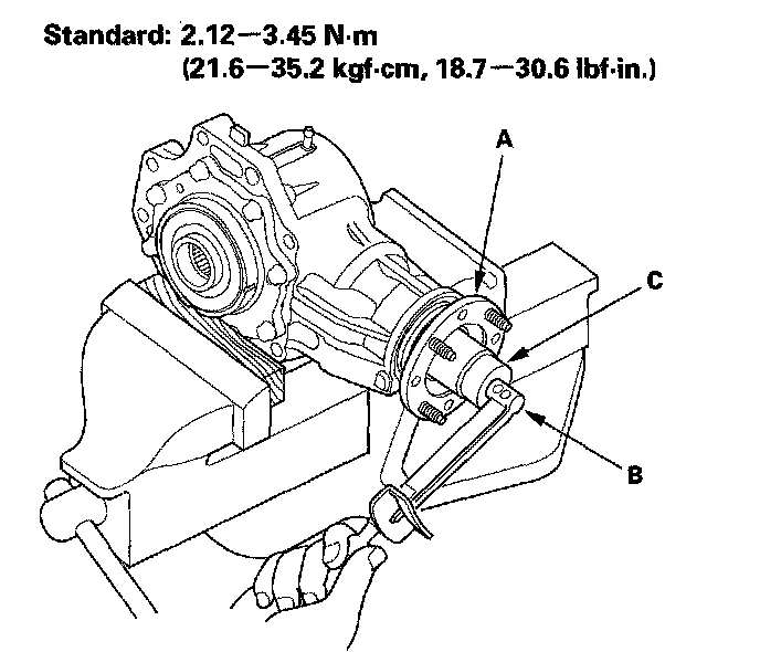 4. Measure staring torque at the companion flange (A) using a torque wrench (B) and a socket (C).