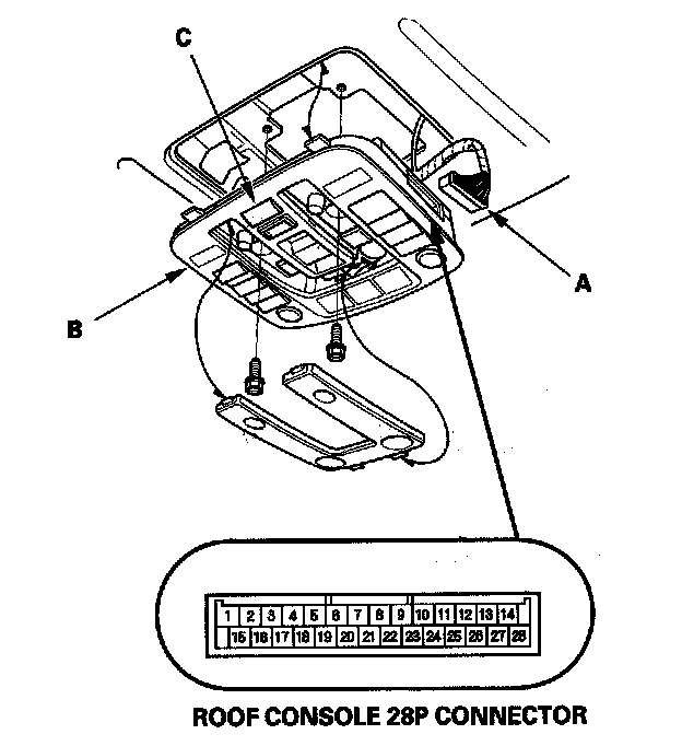 2. Disconnect the 28P connector (A) from the roof console (B).