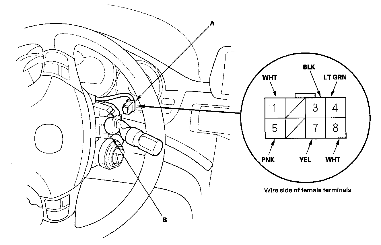 4. Disconnect the 8P connector (A) from the wiper/washer switch (B).