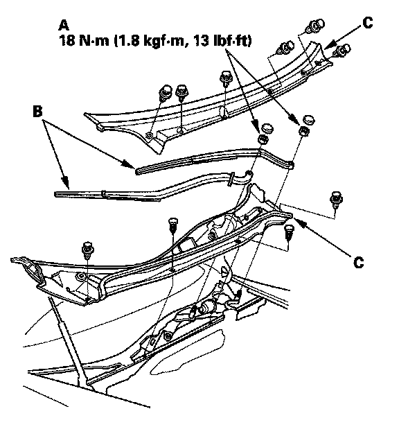 5. Remove the four bolts (B) and wiper linkage assembly (C).