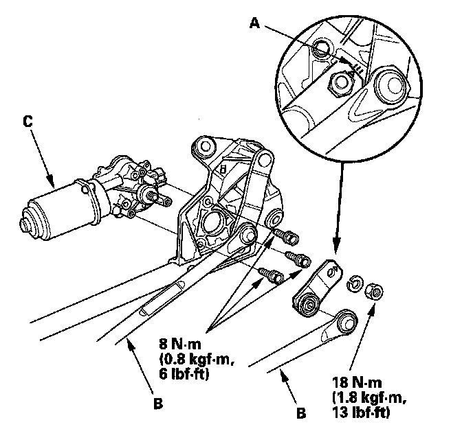 6. Scribe a line (A) across the link and windshield wiper linkage to show the original adjustment. Separate the windshield wiper linkage (B) from the wiper motor (C).