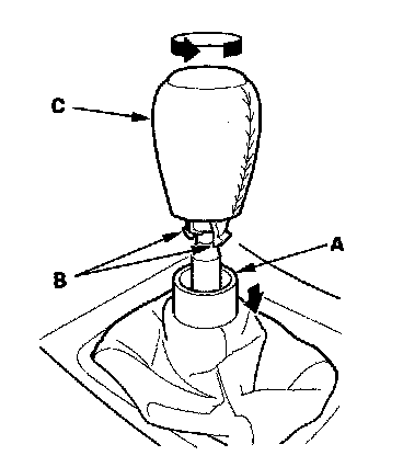 4. M/T: Lower the shift lever boot (A) to release the hooks (B) from the boot, then remove the shift knob (C).