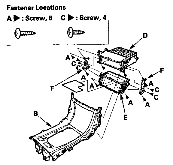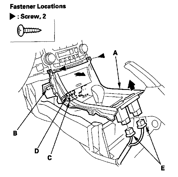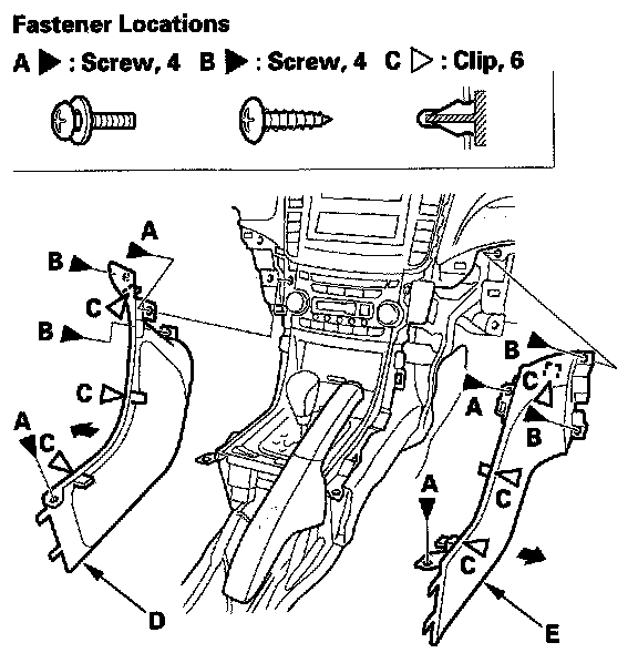 6. Remove the screws (A, B), and detach the clips (C), then remove the driver's console side cover (D) and passenger's console side cover (E).
