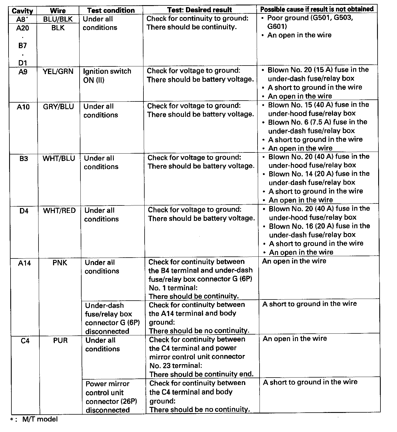 5. With the power seat control unit still disconnected, make these input tests at the connectors.
