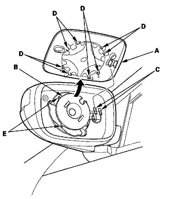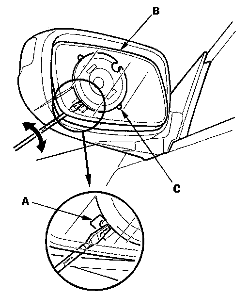 5. Separate the mirror holder (A) from the actuator (B). Disconnect the mirror defogger connectors (C) from the heater pad terminals.