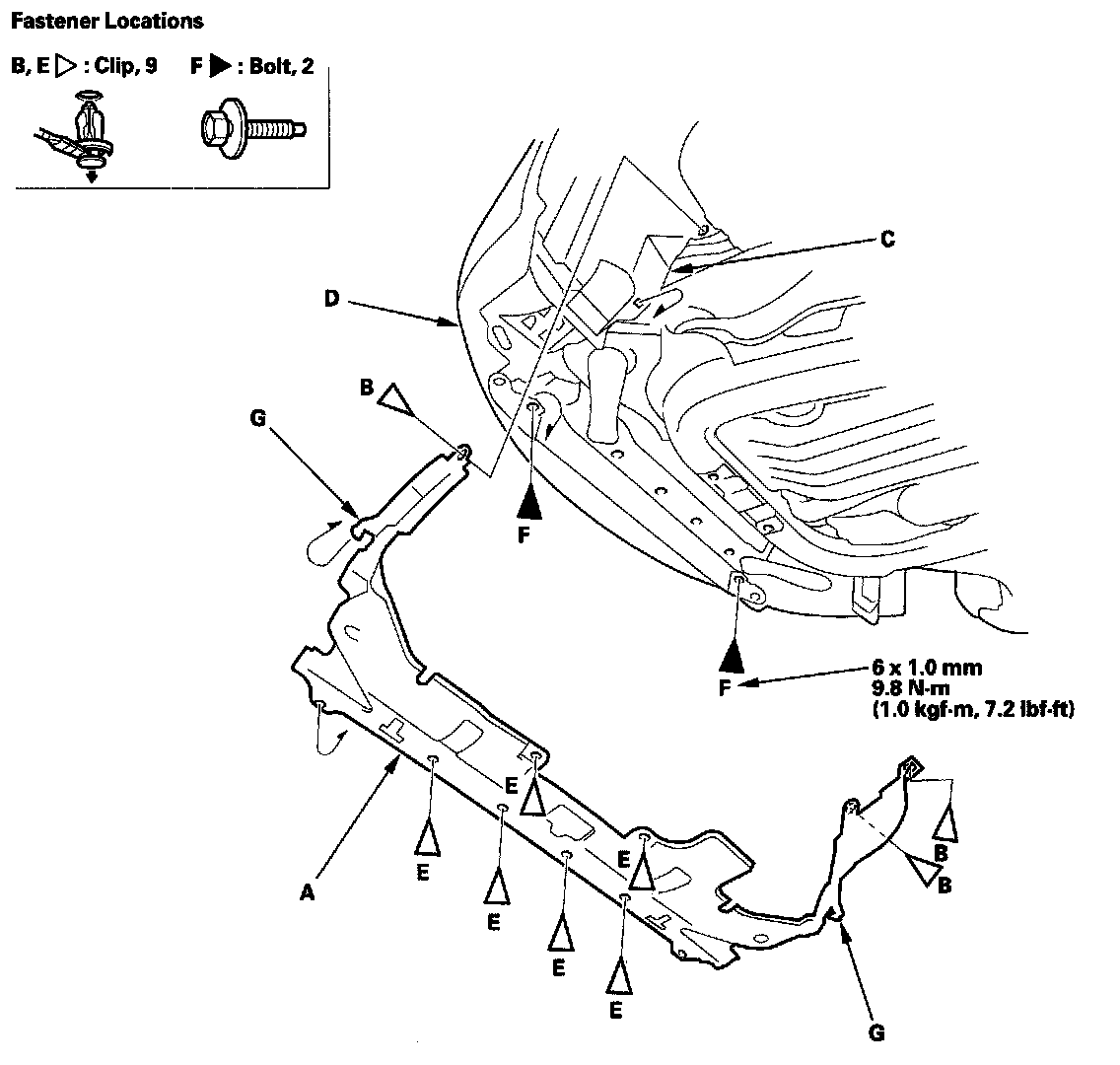 1. From both wheel arches, remove the clips (B) securing the front inner fender (C) and splash shield to the body.