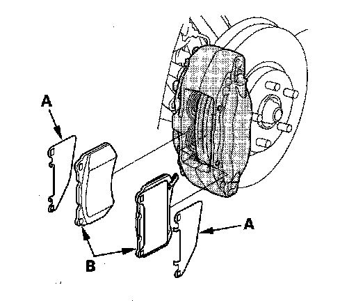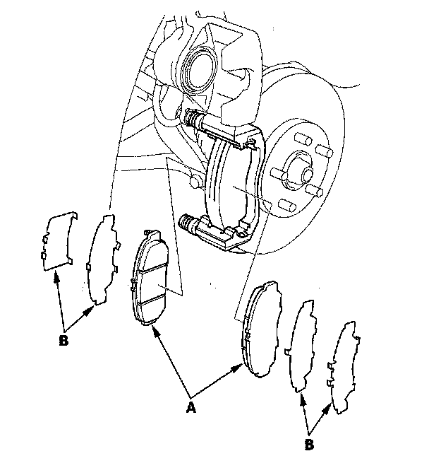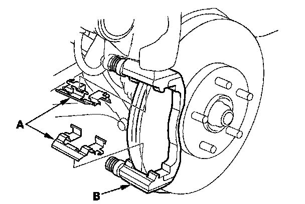 12. Install the brake pads and pad shims correctly. Install the brake pad with the wear indicator (B) on the top outside. If you are reusing the brake pads, always reinstall the brake pads in their original positions to prevent a momentary loss of braking efficiency.
