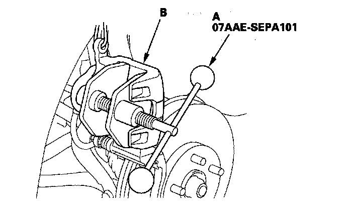11. Mount the brake caliper piston compressor (A) on the caliper body (B).