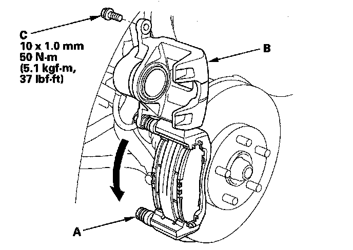 16. Pivot the caliper (B) down into position. Install the flange bolt (C), and torque it to the specified torque while holding the pin A with a wrench being careful not to damage the pin boot.