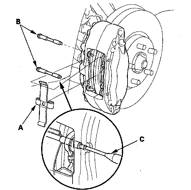 4. Depress pad spring (A). Remove pad pins (B) from caliper by pushing from the outside to the inside with a commercially available 5/32 " pin punch (C).
