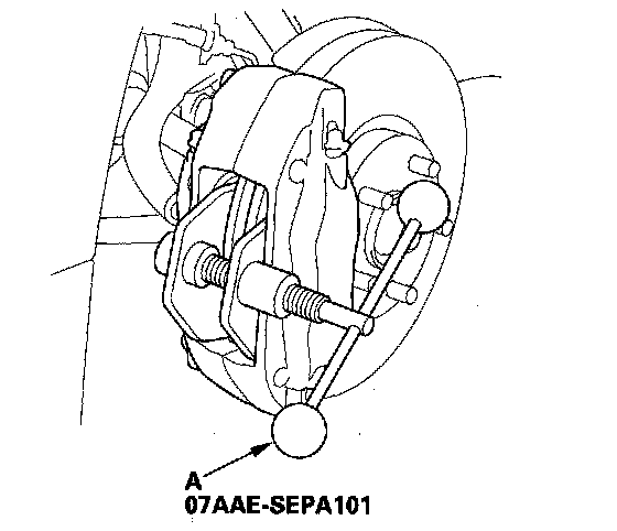 8. Mount the brake caliper piston compressor (A) on the caliper.