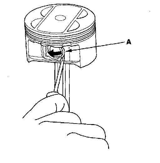 3. Remove the snap rings (A) from both sides of each piston. Start at the cutout in the piston pin bore. Remove the snap rings carefully so they do not go flying or get lost. Wear eye protection.