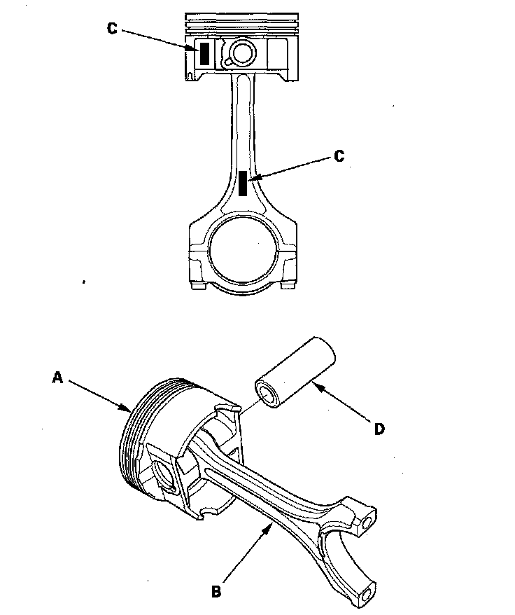 4. Assemble the piston (A) and connecting rod (B) with the embossed marks (C) on the same side. Install the piston pin (D).