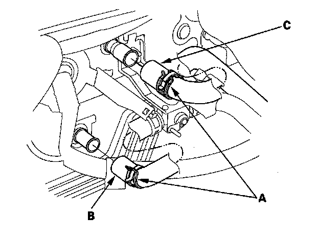 6. Slide the hose clamps (A) back, then disconnect the inlet heater hose (B) and the outlet heater hose (C) from the heater unit. Engine coolant will run out when the hoses are disconnected; drain it into a clean drip pan. Be sure not to let coolant spill on the electrical parts or the painted surfaces. If any coolant spills, rinse it off immediately.