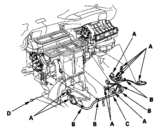 9. Disconnect the connectors (A) from the driver's mode control motor, the driver's air mix control motor, the evaporator temperature sensor, the power transistor, the passenger's mode control motor, passenger's air mix control motor, and the recirculation control motor, then remove the wire harness clips (B), the wire harness (C), and the carpet clip (D).