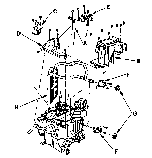 11. Remove the self-tapping screws, the evaporator temperature sensor (A) and the joint duct (B). Remove the self-tapping screws, then remove the passenger's heater outlet (C), and the heater core cover (D). Remove the self-tapping screws and the passenger's air mix control motor (E). Remove the self-tapping screws, the heater pipe brackets (F), the grommets (G) and carefully pull out the heater core (H) so you don't bend the inlet and outlet pipes.