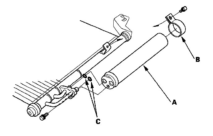 2. Remove the bolts from the A/C condenser, then remove the receiver/dryer (A), the bracket (B) and the O-rings (C).