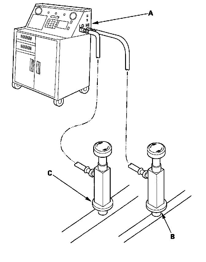 1. Connect an R-134a refrigerant recovery/recycling/charging station (A) to the high-pressure service port (B) and the low-pressure service port (C), as shown, following the equipment manufacturer's instructions.