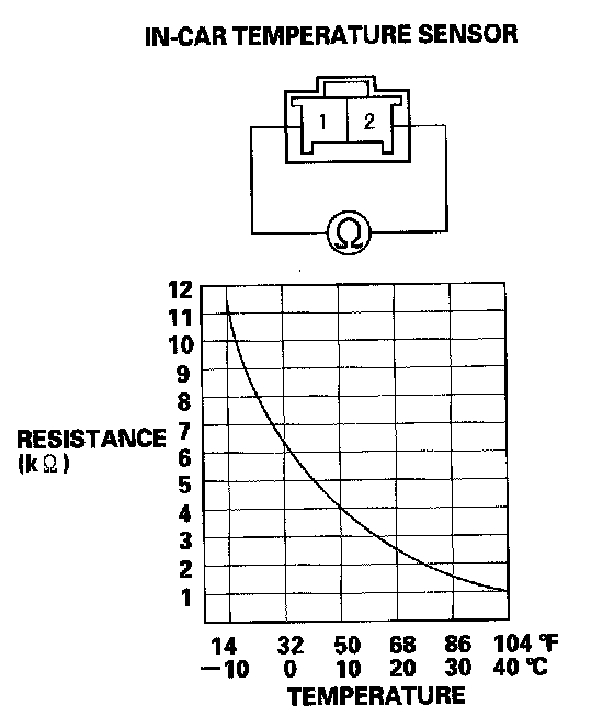 3. Compare the resistance reading between the No. 1 and No. 2 terminals of the in-car temperature sensor with the specifications shown in the graph; the resistance should be within the specifications.