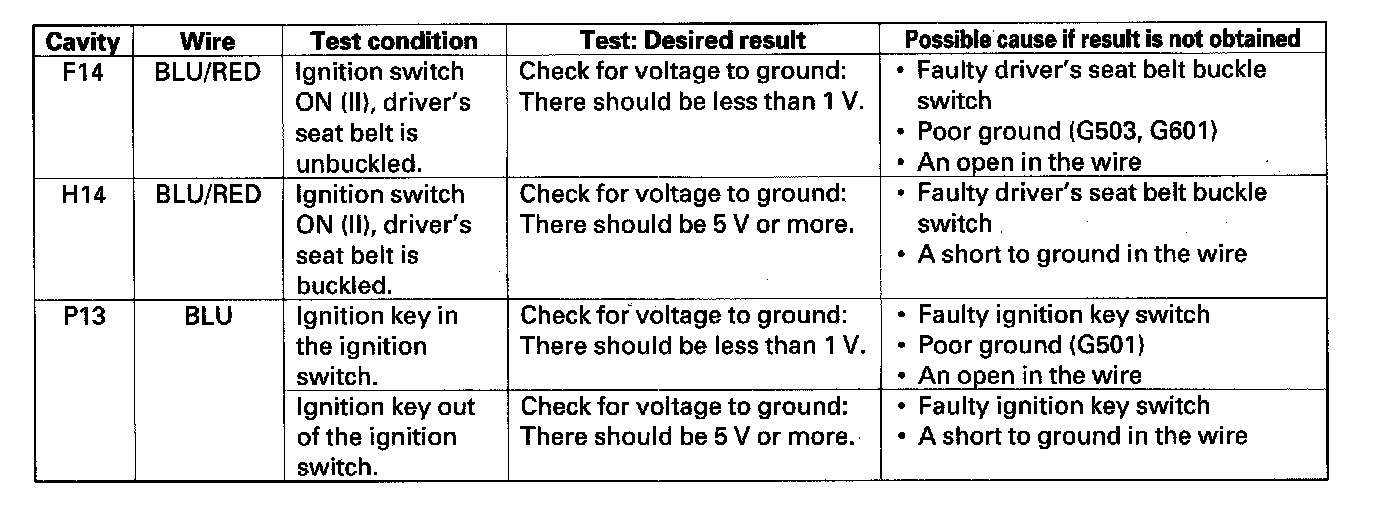 - If the beeper sounds and the seat belt reminder light flashes, go to step 14.