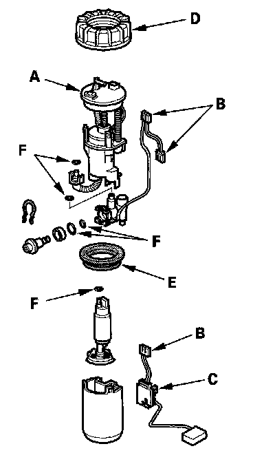 4. Install the parts in the reverse order of removal with a new locknut (D) a new base gasket (E), and new O-rings (F). When installing the fuel tank unit, align the marks on the unit and the fuel tank.
