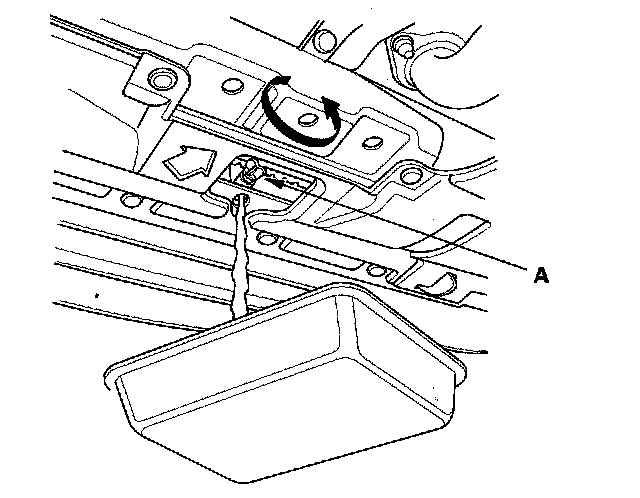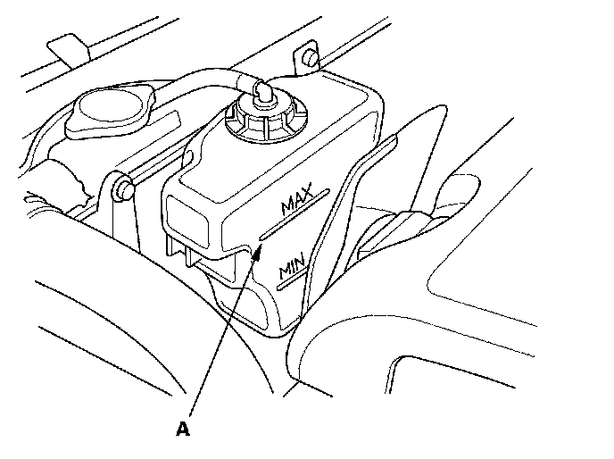 8. Fill the coolant reservoir to the MAX mark (A) with Acura Long Life Antifreeze/Coolant Type 2 (P/N 0L999-9001).