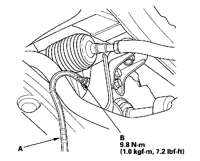 4. Install a rubber hose (A) on the drain bolt (B) located at the rear of the engine block, then loosen the drain bolt.