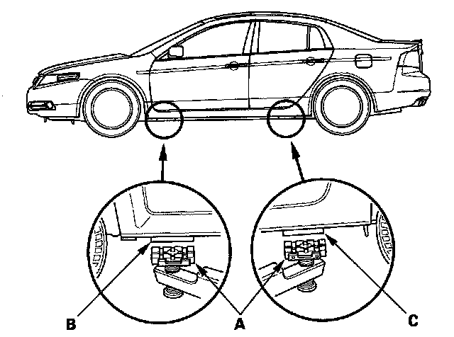 1. Position the lift blocks (A) under the vehicle's front support points (B) and rear support lift (C).