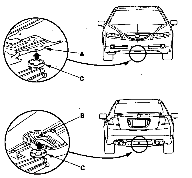 3. Position the floor jack under the front jacking bracket (A) or the rear jacking bracket (B). Center the jacking bracket on the jack lift platform (C), and jack up the vehicle high enough to fit the safety stands under it.