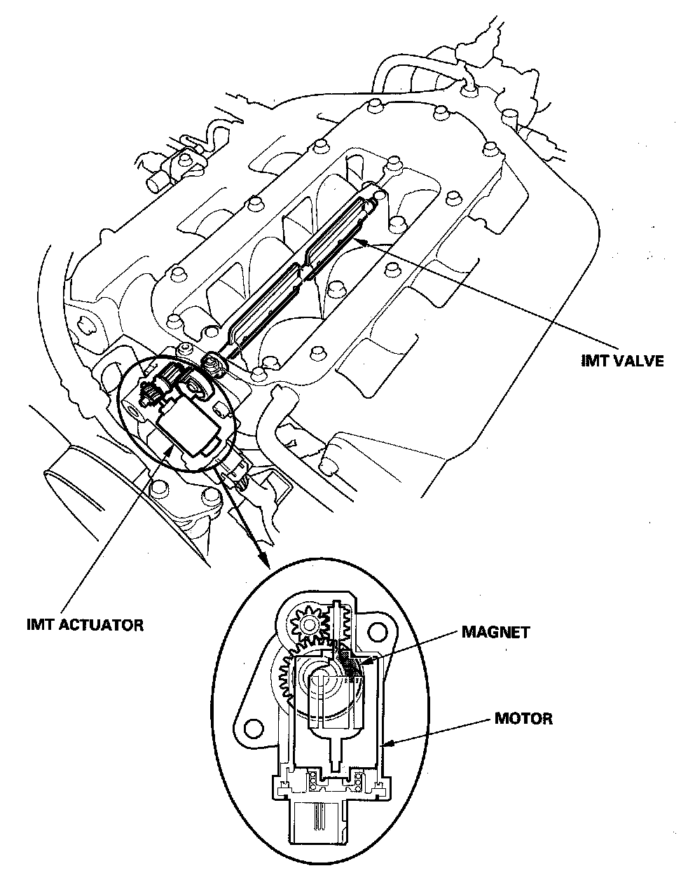 Engine power is adjusted by opening and closing the intake manifold tuning (IMT) actuator. When the valve is closed, there is high torque at low engine speed. When the valve is open, there is high torque at high engine speed. The intake manifold tuning (IMT) valve actuator has a sensor that detects the IMT valve position and sends the position signal to the ECM/PCM.