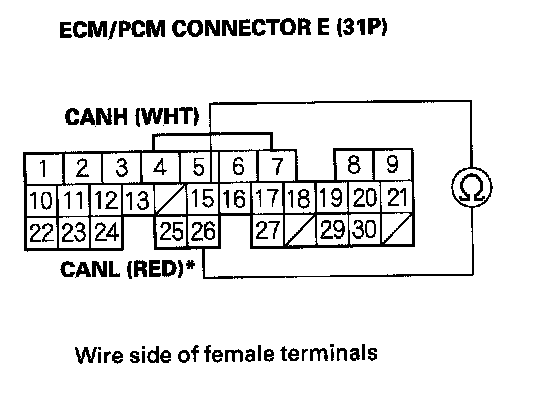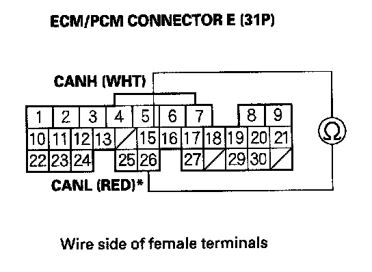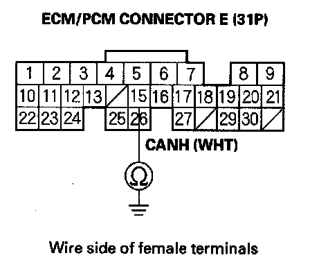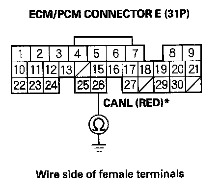 31. Measure resistance between ECM/PCM connector terminals E15 and E26*.