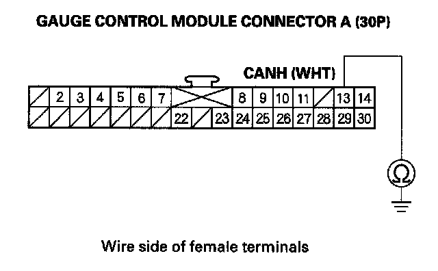 13. Check for continuity between gauge control module connector terminal A13 and body ground.