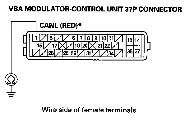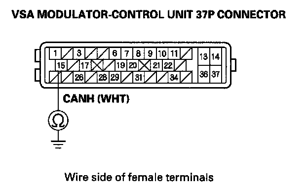 14. Check for continuity between VSA modulator-control unit 37P connector terminal No. 15 and body ground.