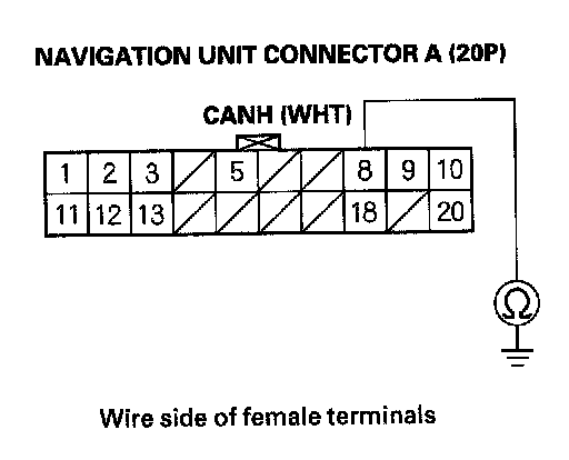 16. Check for continuity between navigation unit connector terminal A8 and body ground.