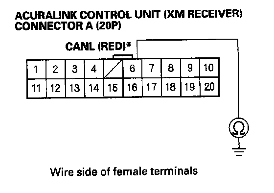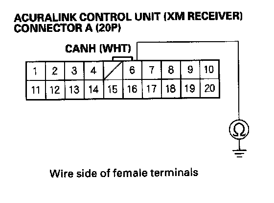 18. Check for continuity between AcuraLink control unit (XM receiver) connector terminal A6 and body ground.