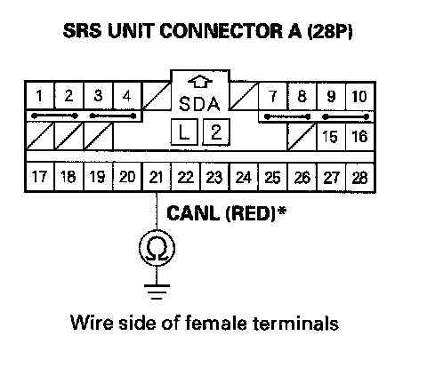 15. Check for continuity between SRS unit connector terminal A20 and body ground.
