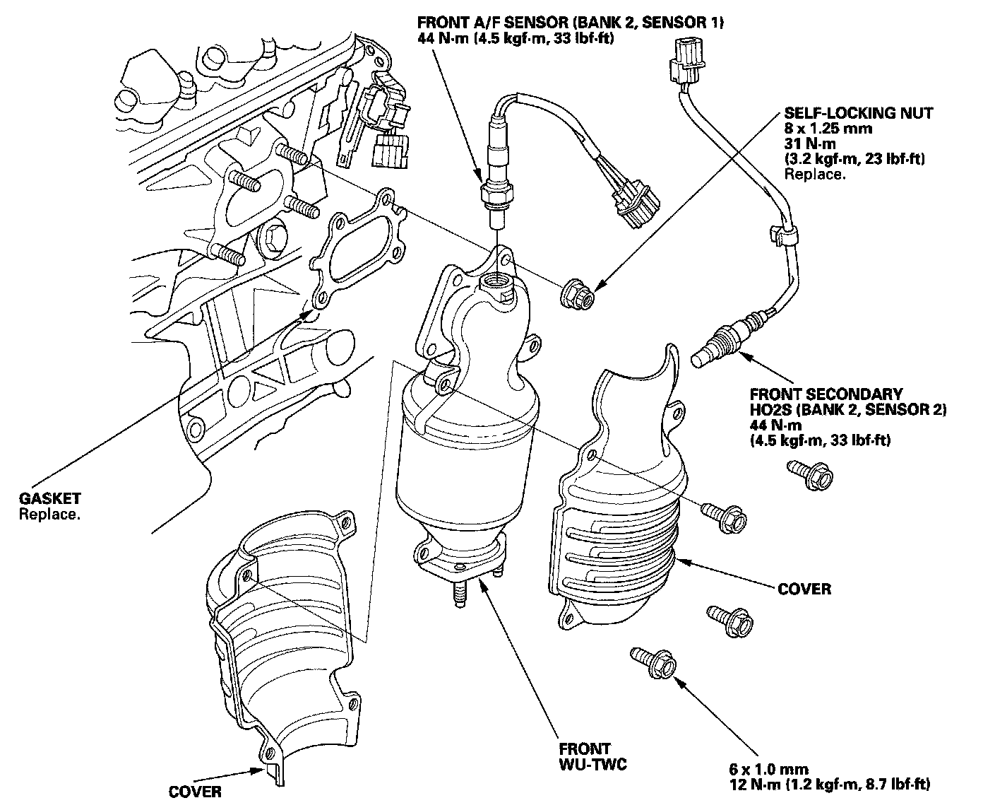 2. Disconnect the front air fuel ratio (A/F) sensor connector and front secondary heated oxygen sensor (secondary HO2S) connector.