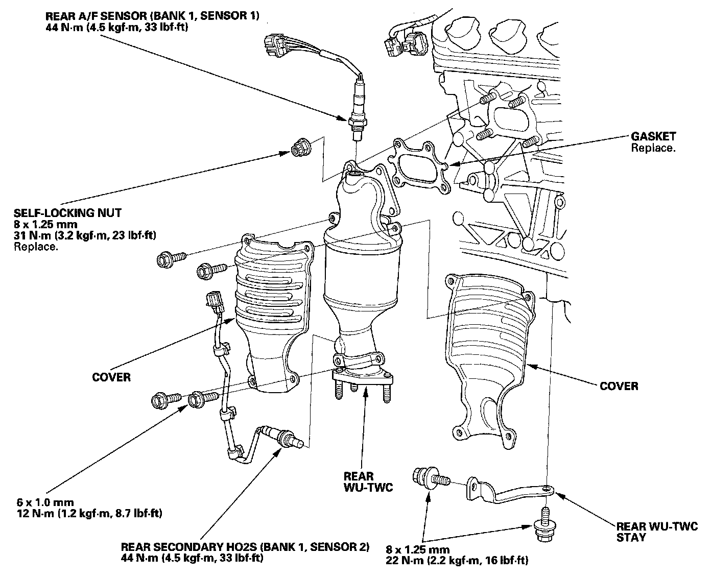 2. Disconnect the rear air fuel ratio (A/F) sensor connector and rear secondary heated oxygen sensor (secondary HO2S) connector.