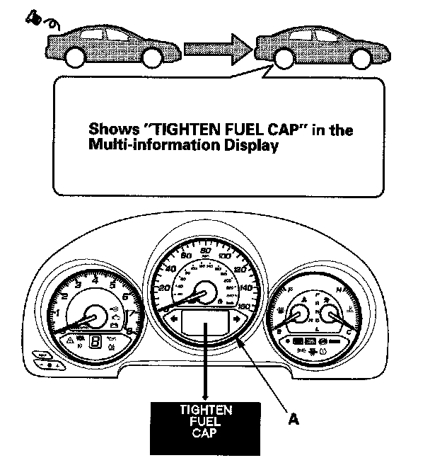 The first time a leak is detected a "TIGHTEN FUEL CAP" message in the gauge display (A). To scroll to another message, press the select/reset button. The "TIGHTEN FUEL CAP" message will appear each time you restart the engine until the system turns the message off. Turn the engine off then replace or tighten the fuel fill cap until it clicks at least once. The message should go off after several days of normal driving after the fuel fill cap has been tightened or replaced.