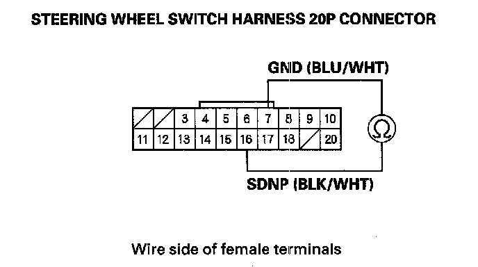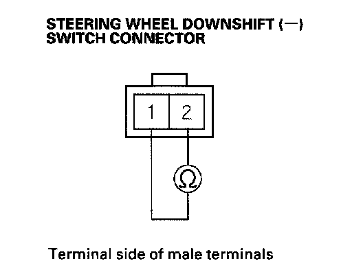 4. Check for continuity between the steering wheel downshift (-) switch connector terminals while pressing the switch and when the switch is released.