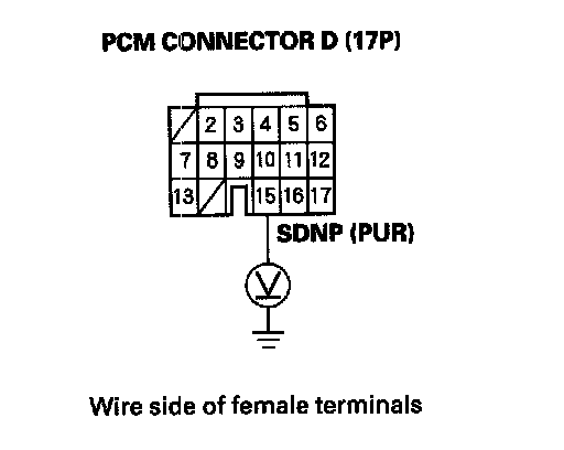 10. Measure the voltage between PCM connector terminal D15 and body ground.