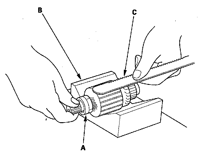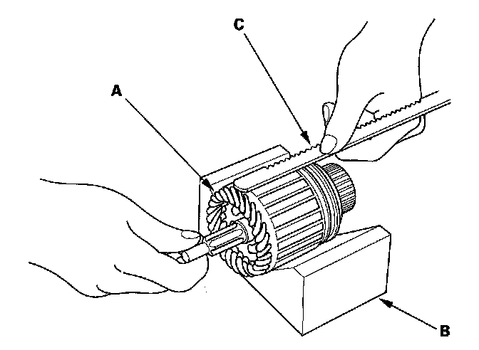 9. Place the armature (A) on an armature tester (B). Hold a hacksaw blade (C) on the armature core. If the blade is attracted to the core or vibrates while the core is turned, the armature is shorted. Replace the armature.