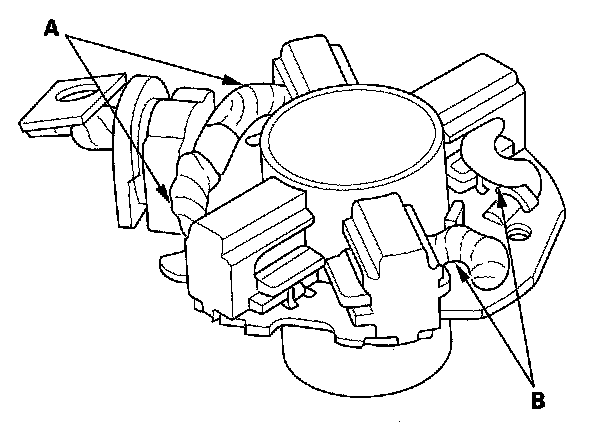 12. Check for continuity between the (+) brush holder (A) and ( - ) brush holder (B). If there is continuity, replace the brush holder assembly.