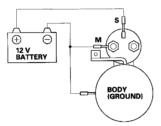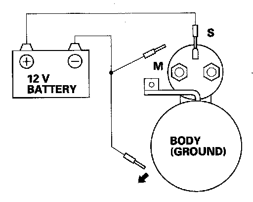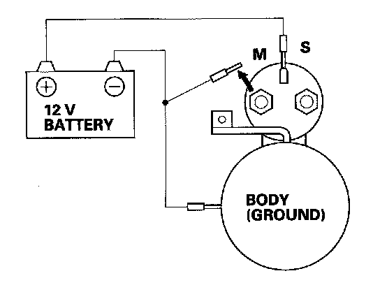 3. Connect the battery as shown. Make sure you disconnect the starter motor wire from the solenoid. If the starter pinion moves out, it is working properly.