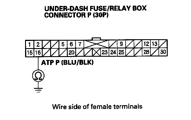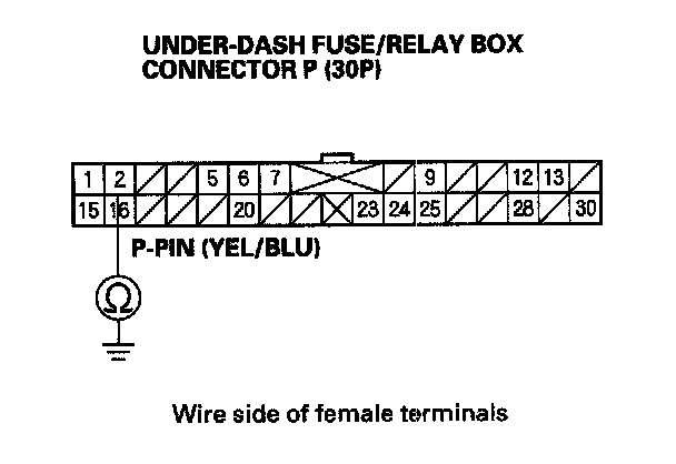9. Check for continuity between under-dash fuse/relay box 30P connector terminal P16 and body ground.