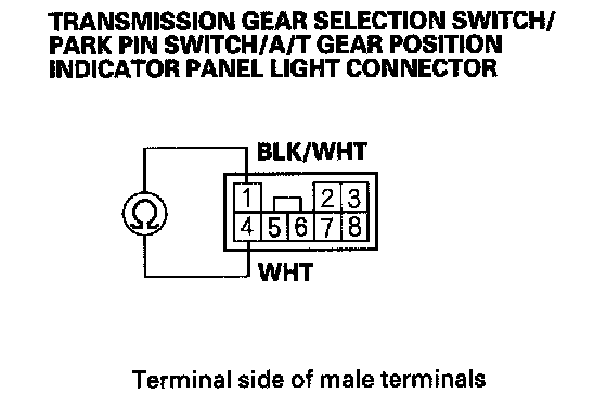 13. Check for continuity between transmission gear selection switch/park pin switch/A/T gear position indicator panel light connector terminal No. 1 and body ground.