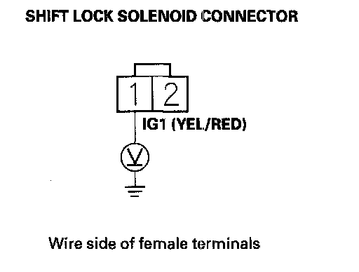 9. Release the brake pedal, and measure the voltage between shift lock solenoid connector terminals No. 1 and No. 2. The shift lever must be in the P position.