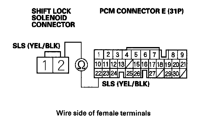 13. Check for continuity between PCM connector terminal E22 and shift lock solenoid connector terminal No. 2.